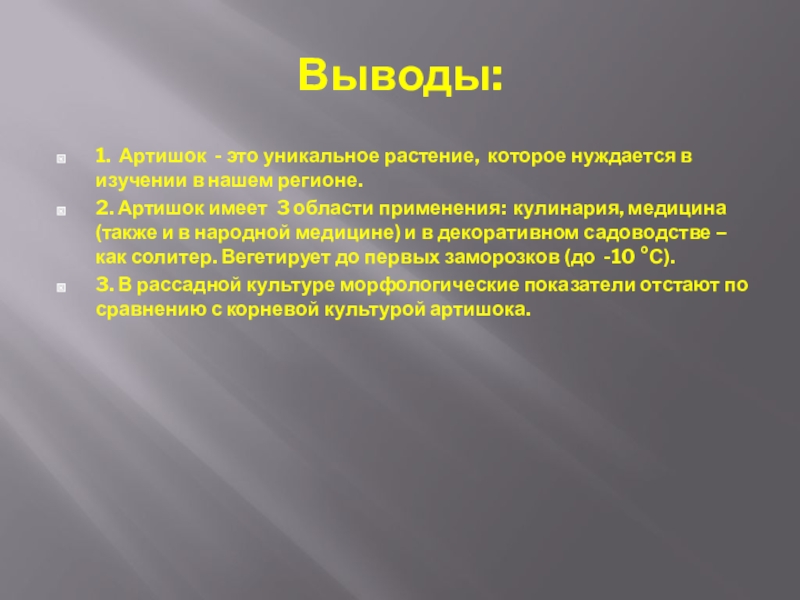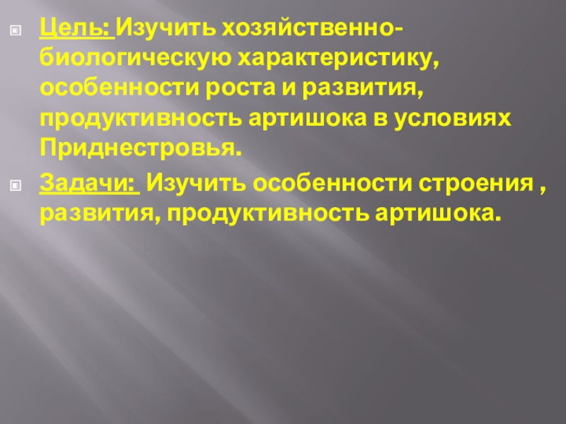 Слайд 2Цель: Изучить хозяйственно-биологическую характеристику, особенности роста и развития, продуктивность артишока в