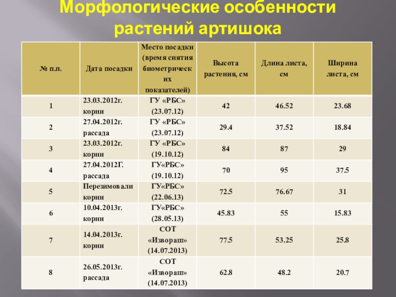 3. В рассадной культуре морфологические показатели отстают по сравнению с корневой культурой артишока.
