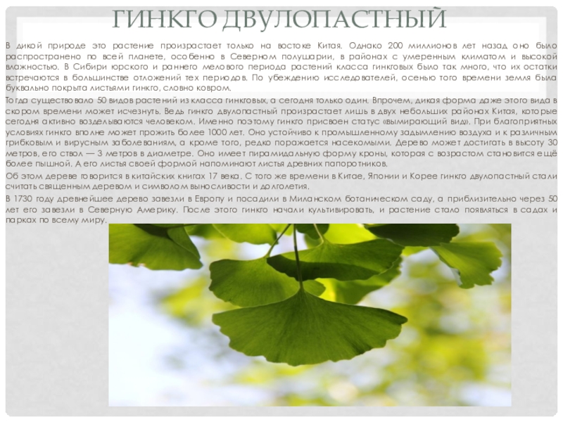 Тогда существовало 50 видов растений из класса гинкговых, а сегодня только один. Впрочем, дикая форма даже этого вида в скором времени может исчезнуть. Ведь гинкго двулопастный произрастает лишь в двух небольших районах Китая, которые сегодня активно возделываются человеком. Именно поэтому гинкго присвоен статус «вымирающий вид». При благоприятных условиях гинкго вполне может прожить более 1000 лет. Оно устойчиво к промышленному задымлению воздуха и к различным грибковым и вирусным заболеваниям, а кроме того, редко поражается насекомыми. Дерево может достигать в высоту 30 метров, его ствол — 3 метров в диаметре. Оно имеет пирамидальную форму кроны, которая с возрастом становится ещё более пышной. А его листья своей формой напоминают листья древних папоротников.