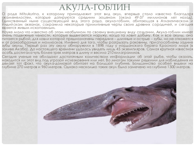 Науке мало что известно об этом необычном по своему внешнему виду создании. Акула-гоблин имеет очень подвижные челюсти, которые выдвигаются наружу, когда та ловит добычу. Как и все акулы, она питается рыбой, для ловли которой предназначены передние – длинные и острые – зубы, но не откажется и от ракообразных и моллюсков. Именно для того, чтобы разгрызать раковины, приспособлены задние зубы акулы. Первый раз эту акулу обнаружили в 1898 году у иорданского берега Красного моря (в заливе Акаба). До настоящего времени удалось увидеть лишь 45 экземпляров. Самая крупная известная особь достигала чуть более трех метров в длину и весила 210 килограммов.