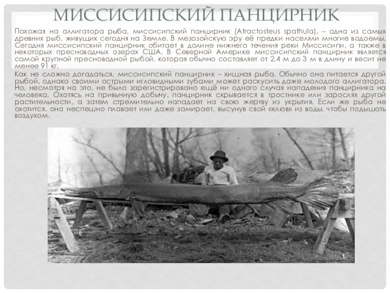 из самых древних рыб, живущих сегодня на Земле. В мезозойскую эру её предки населяли многие водоемы. Сегодня миссисипский панцирник обитает в долине нижнего течения реки Миссисипи, а также в некоторых пресноводных озерах США. В Северной Америке миссисипский панцирник является самой крупной пресноводной рыбой, которая обычно составляет от 2,4 м до 3 м в длину и весит не менее 91 кг.