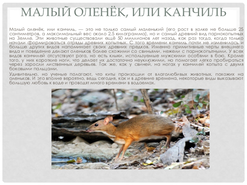 самый маленький (его рост в холке не больше 25 сантиметров, а максимальный вес около 2,5 килограмма), но и самый древний вид парнокопытных на Земле. Эти животные существовали ещё 50 миллионов лет назад, как раз тогда, когда только начали формироваться отряды древних копытных. С того времени канчиль почти не изменилась и больше других видов напоминает своих древних предков. Именно примитивные черты внешнего вида и поведение делают оленьков более схожими со свиньями, нежели с парнокопытными. У всех видов канчилей отсутствуют рога, но есть клыки, используемые мужскими особями в бою. Кроме того, у них короткие ноги, что делает их достаточно неуклюжими, но помогает легко пробираться через заросли лиственных деревьев. Так же, как у свиней, на ногах у канчилей копыта с двумя боковыми пальцами.