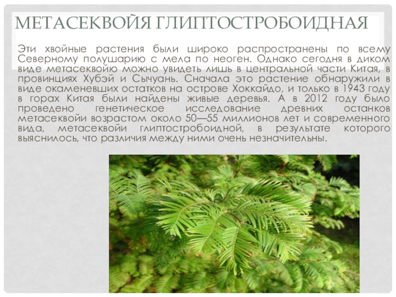 с мела по неоген. Однако сегодня в диком виде метасеквойю можно увидеть лишь в центральной части Китая, в провинциях Хубэй и Сычуань. Сначала это растение обнаружили в виде окаменевших остатков на острове Хоккайдо, и только в 1943 году в горах Китая были найдены живые деревья. А в 2012 году было проведено генетическое исследование древних останков метасеквойи возрастом около 50—55 миллионов лет и современного вида, метасеквойи глиптостробоидной, в результате которого выяснилось, что различия между ними очень незначительны.