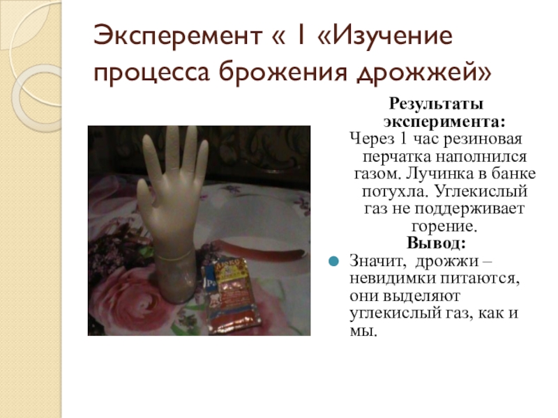Слайд 17Эксперемент « 1 «Изучение процесса брожения дрожжей»