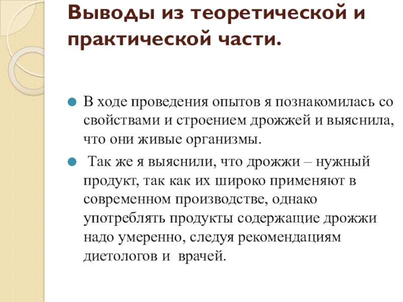 Так же я выяснили, что дрожжи – нужный продукт, так как их широко применяют в современном производстве, однако употреблять продукты содержащие дрожжи надо умеренно, следуя рекомендациям диетологов и врачей.