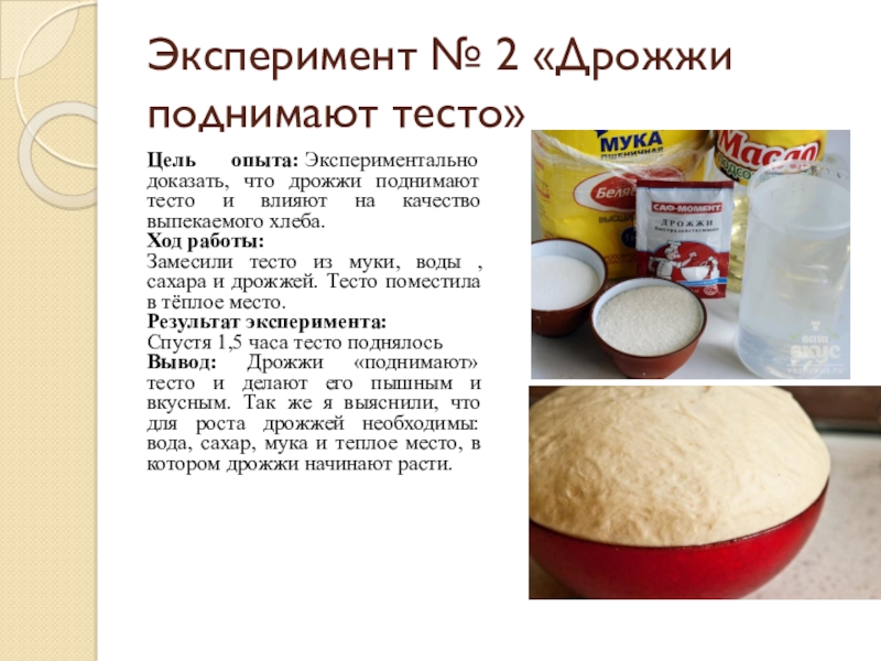 Слайд 18Эксперимент № 2 «Дрожжи поднимают тесто»