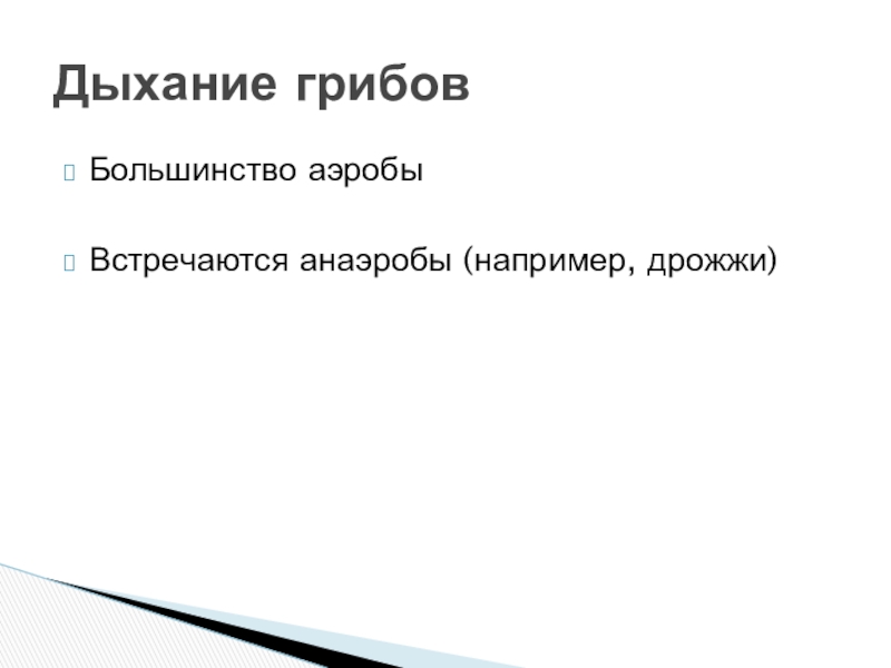 Большинство аэробыВстречаются анаэробы (например, дрожжи)Дыхание грибов