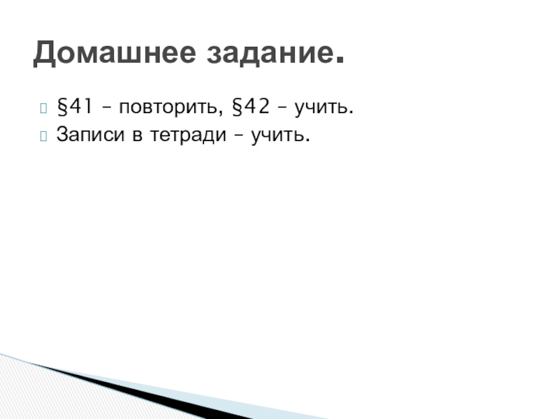 §41 – повторить, §42 – учить. Записи в тетради – учить.Домашнее задание.