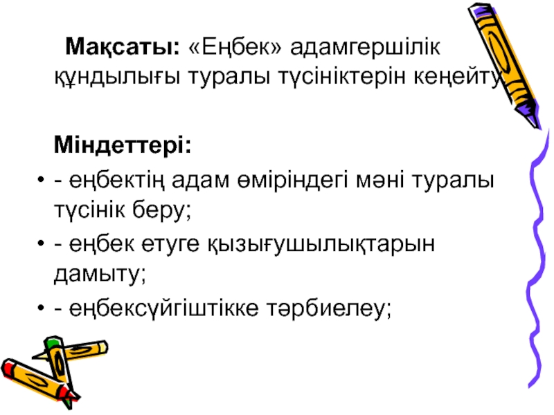 Мақсаты: «Еңбек» адамгершілік құндылығы туралы түсініктерін кеңейту.