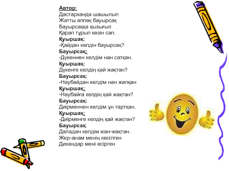 Автор:Дастарханда шашылыпЖатты аппақ бауырсақБауырсаққа қызығыпҚарап тұрып көзін сап.Қуыршақ:-Қайдан келдін бауырсақ?Бауырсақ:-Дүкеннен келдім нан сатқан.Қуыршақ:Дүкенге келдің қай жақтан?Бауырсақ:-Наубайдан