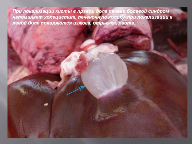 Слайд 14При локализации кисты в правой доле печени болевой синдром напоминает холецистит,