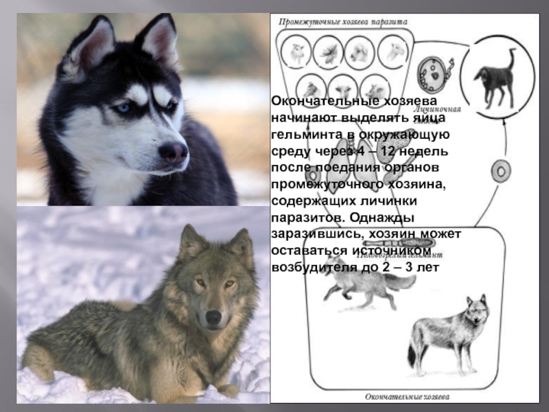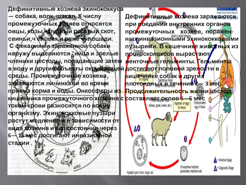 Слайд 7Дефинитивные хозяева эхинококкуса — собака, волк, шакал. К числу промежуточных хозяев