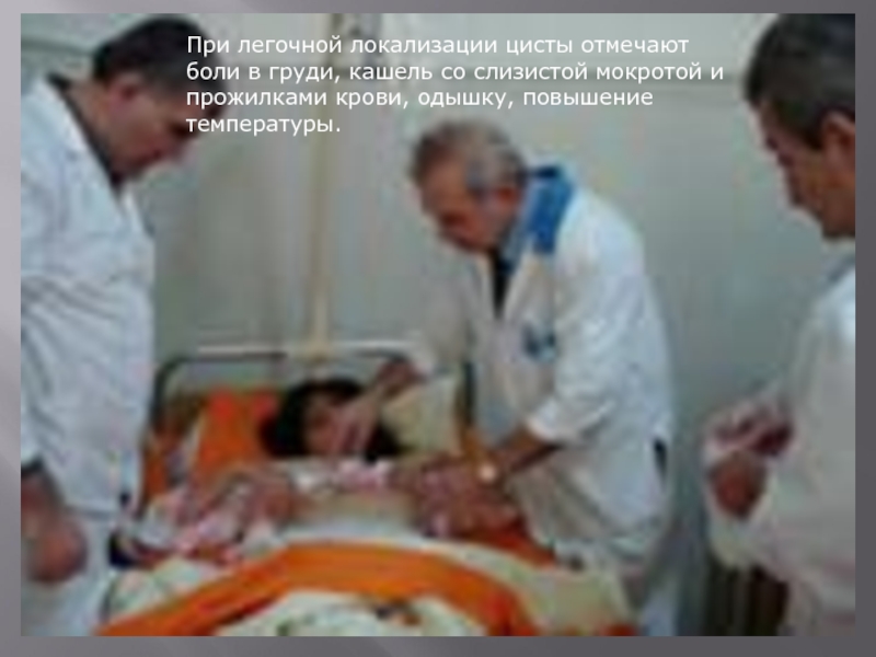 Слайд 27При легочной локализации цисты отмечают боли в груди, кашель со слизистой