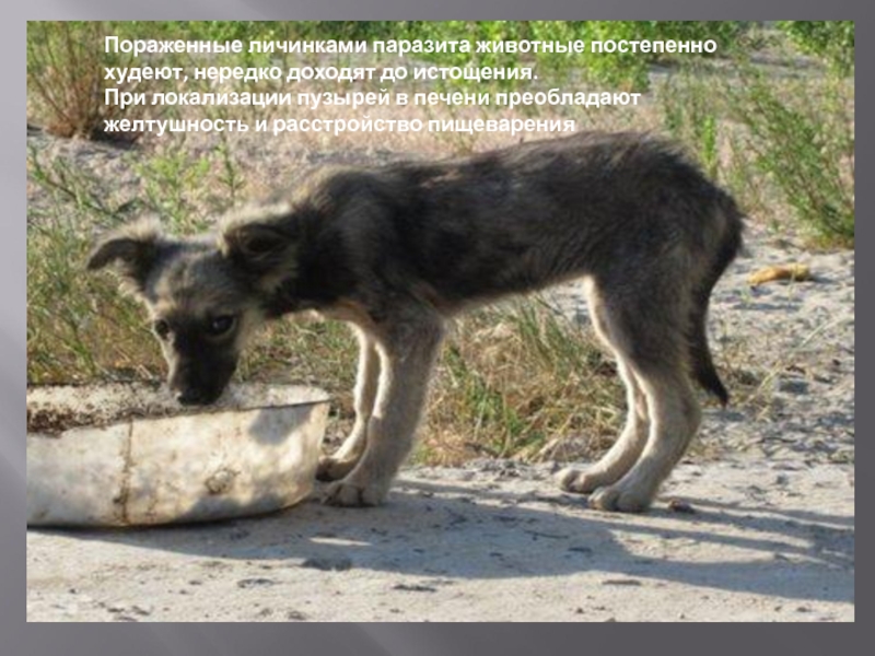 Слайд 15Пораженные личинками паразита животные постепенно худеют, нередко доходят до истощения.