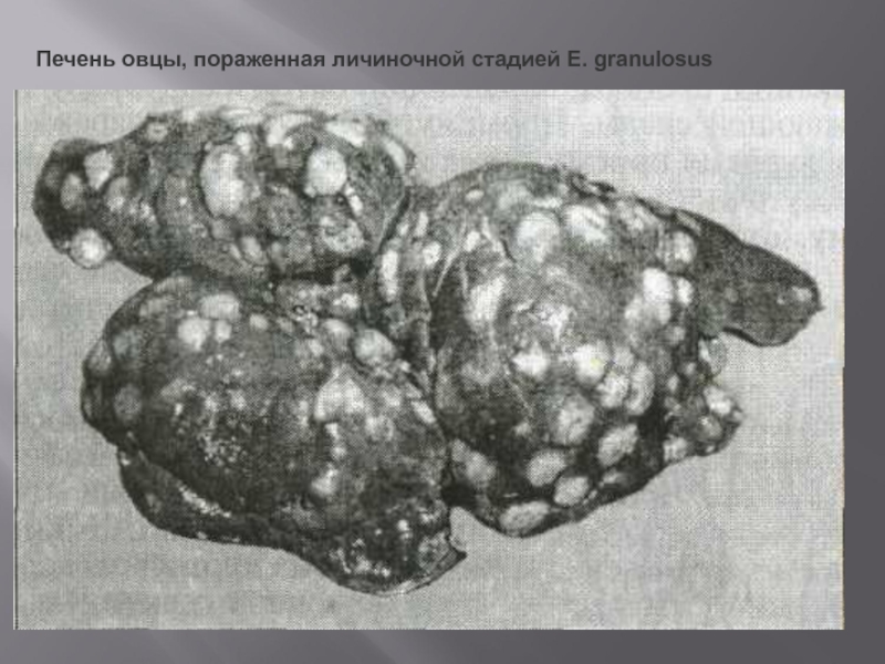 Слайд 18Печень овцы, пораженная личиночной стадией Е. granulosus