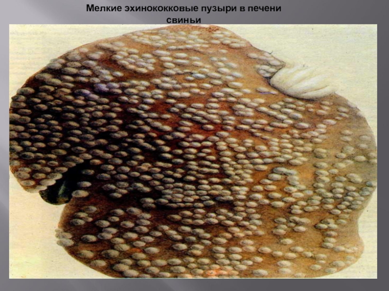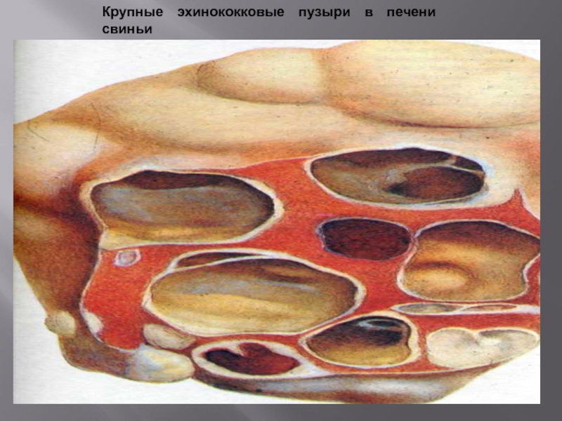 Слайд 17Крупные эхинококковые пузыри в печени свиньи
