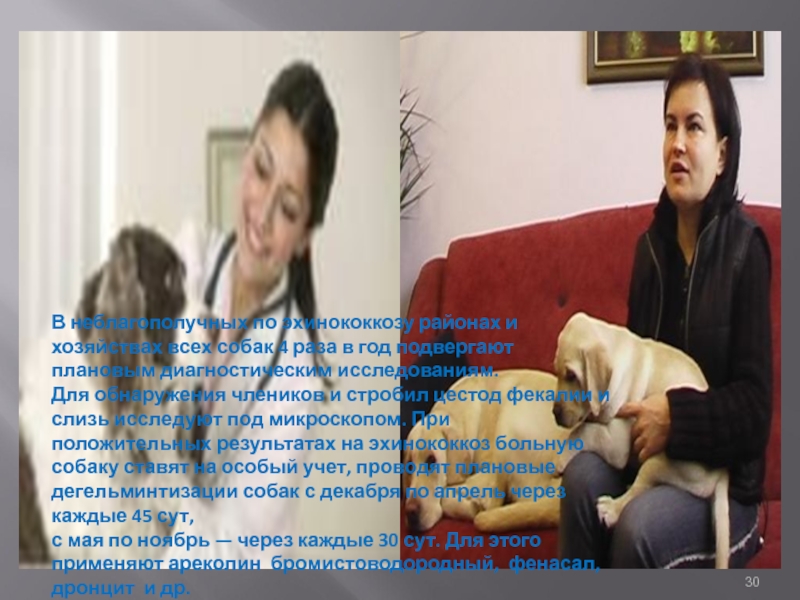 Слайд 30В неблагополучных по эхинококкозу районах и хозяйствах всех собак 4 раза