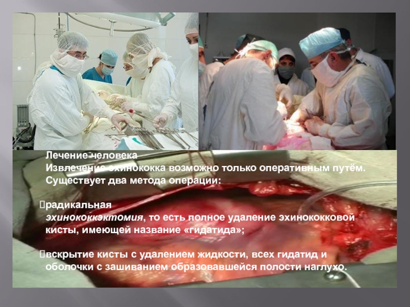 Извлечение эхинококка возможно только оперативным путём. Существует два метода операции: