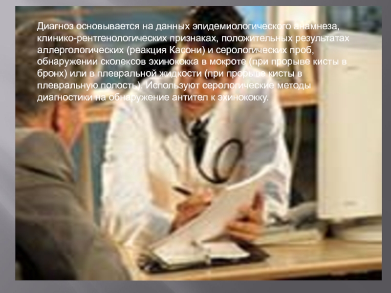 (реакция Касони) и серологических проб, обнаружении сколексов эхинококка в мокроте (при прорыве кисты в бронх) или в плевральной жидкости (при прорыве кисты в плевральную полость). Используют серологические методы диагностики на обнаружение антител к эхинококку.