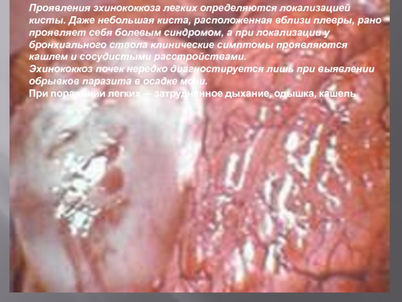 Слайд 19Проявления эхинококкоза легких определяются локализацией кисты. Даже небольшая киста, расположенная вблизи