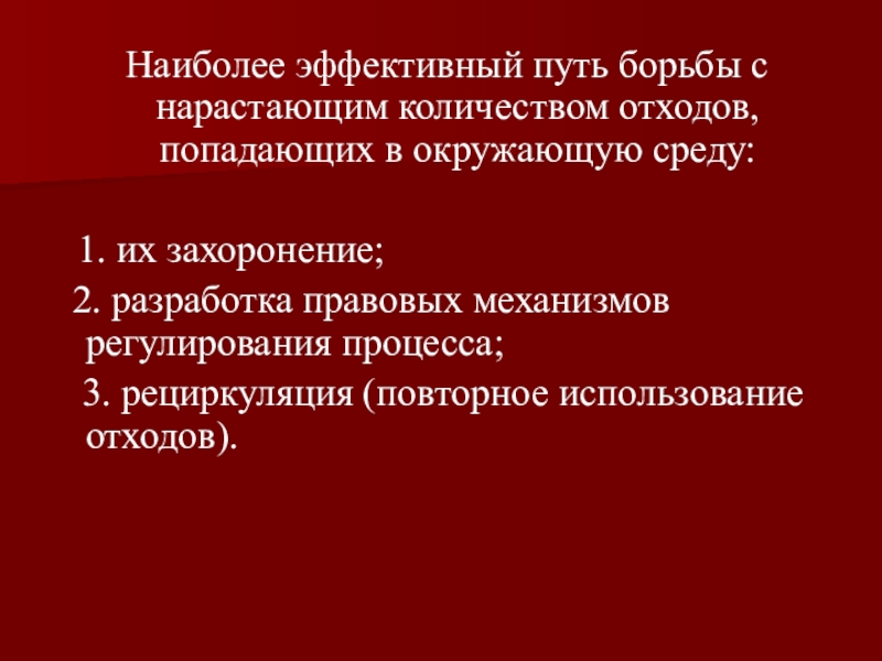 Наиболее эффективный путь борьбы с нарастающим количеством отходов, попадающих в окружающую среду: 1. их захоронение; 2.
