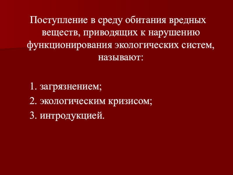 Поступление в среду обитания вредных веществ, приводящих к нарушению функционирования экологических систем, называют:   1.