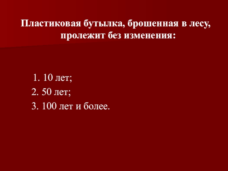 Пластиковая бутылка, брошенная в лесу, пролежит без изменения:       1. 10