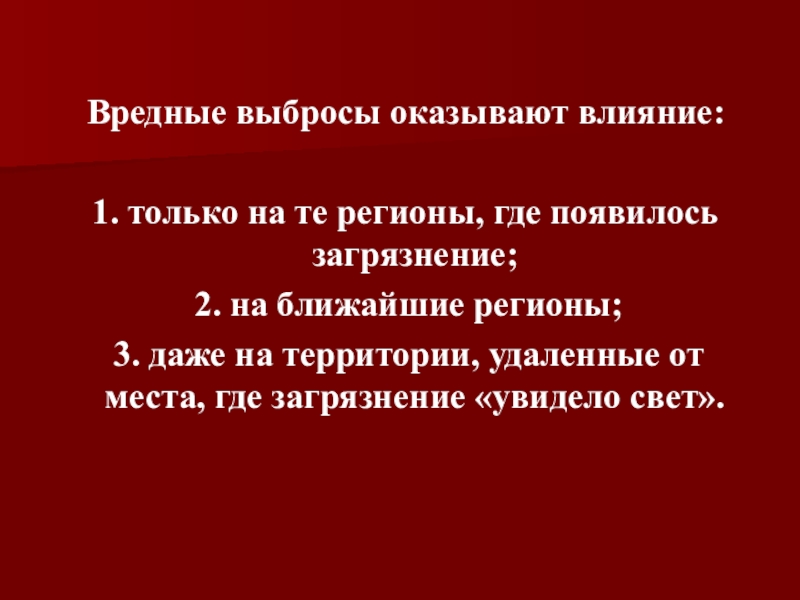 Вредные выбросы оказывают влияние: 1. только на те регионы, где появилось загрязнение; 2. на ближайшие регионы;