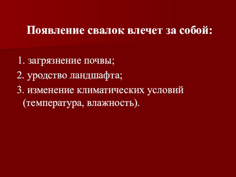 Появление свалок влечет за собой: 1. загрязнение почвы; 2. уродство ландшафта; 3. изменение климатических условий (температура,