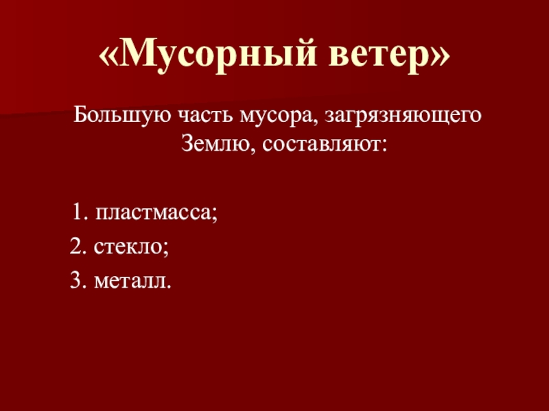 «Мусорный ветер» Большую часть мусора, загрязняющего Землю, составляют:   1. пластмасса;   2. стекло;