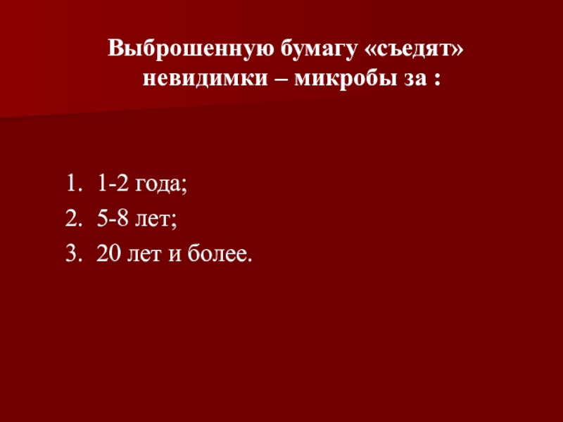 Выброшенную бумагу «съедят» невидимки – микробы за :    1. 1-2 года;