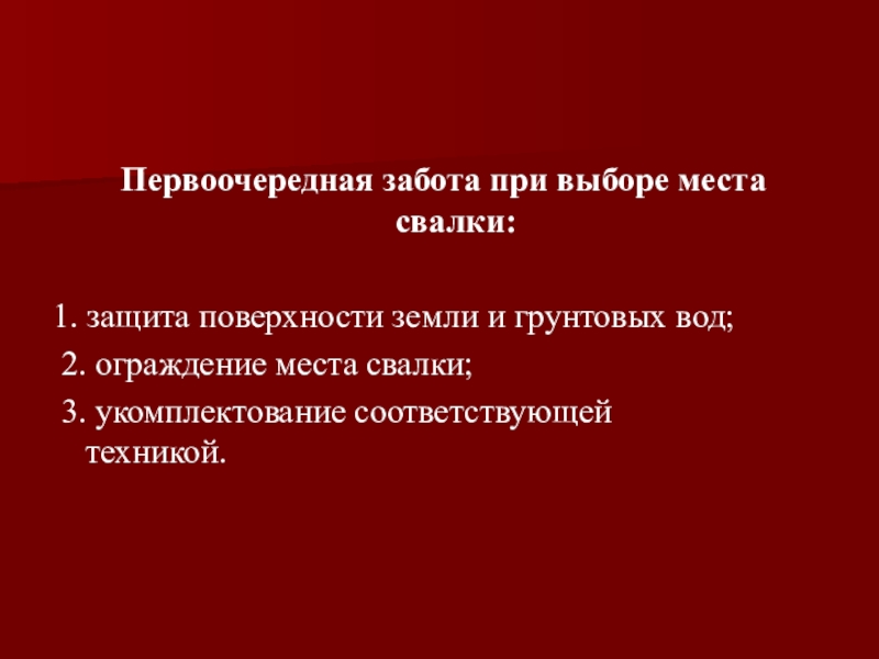 Первоочередная забота при выборе места свалки:1. защита поверхности земли и грунтовых вод; 2. ограждение места свалки;