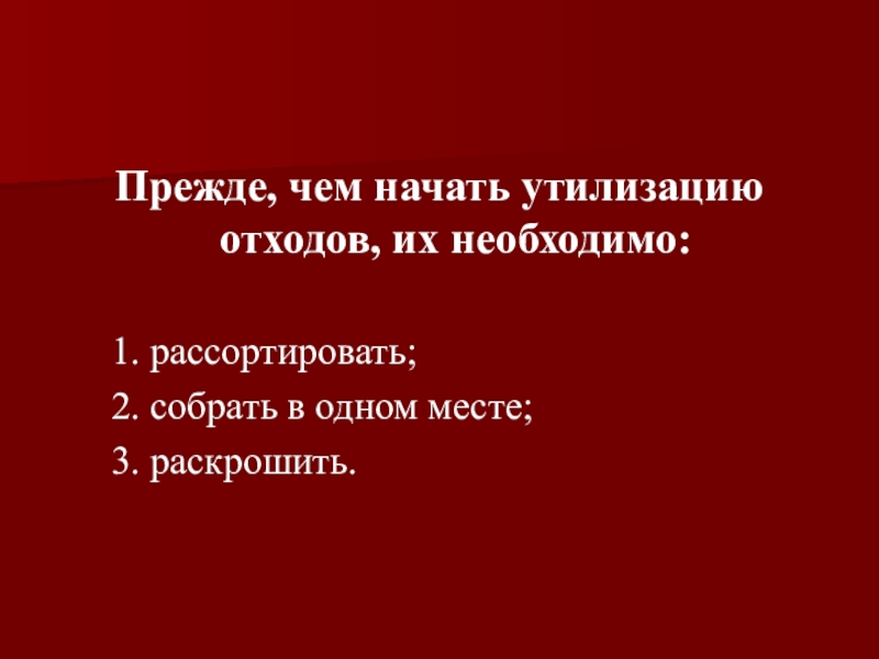 Прежде, чем начать утилизацию отходов, их необходимо:    1. рассортировать;   2. собрать в