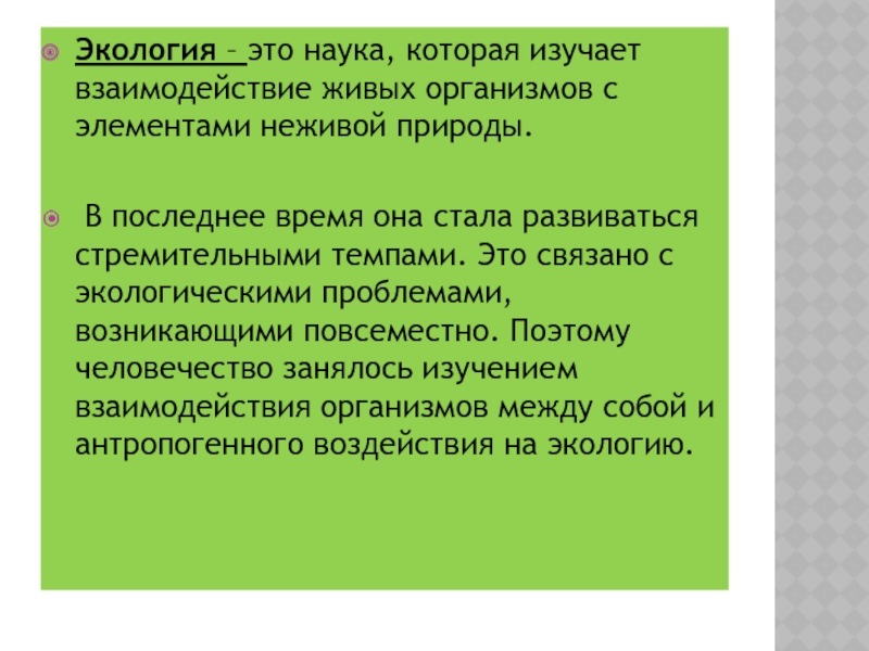 Экология – это наука, которая изучает взаимодействие живых организмов с элементами неживой природы. В последнее время она стала