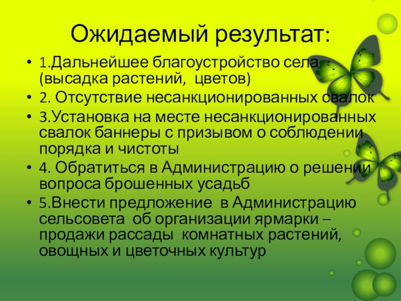Ожидаемый результат:1.Дальнейшее благоустройство села (высадка растений, цветов)2. Отсутствие несанкционированных свалок3.Установка на месте несанкционированных свалок баннеры с призывом