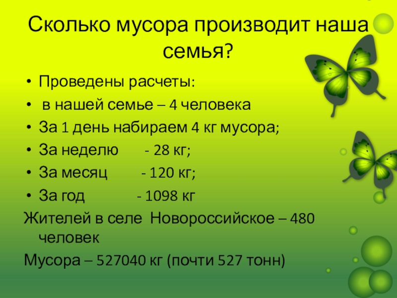 Сколько мусора производит наша семья?Проведены расчеты: в нашей семье – 4 человекаЗа 1 день набираем 4 кг