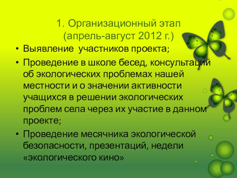 1. Организационный этап (апрель-август 2012 г.)Выявление участников проекта;Проведение в школе бесед, консультаций об экологических проблемах нашей