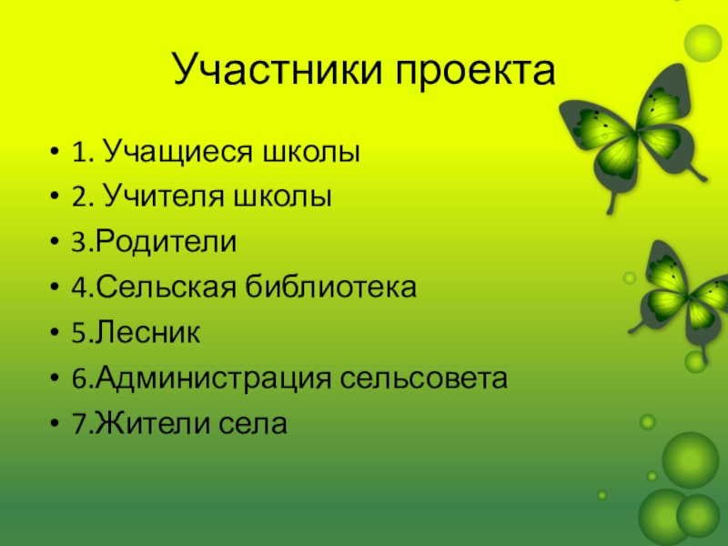 Участники проекта1. Учащиеся школы2. Учителя школы3.Родители4.Сельская библиотека5.Лесник6.Администрация сельсовета7.Жители села