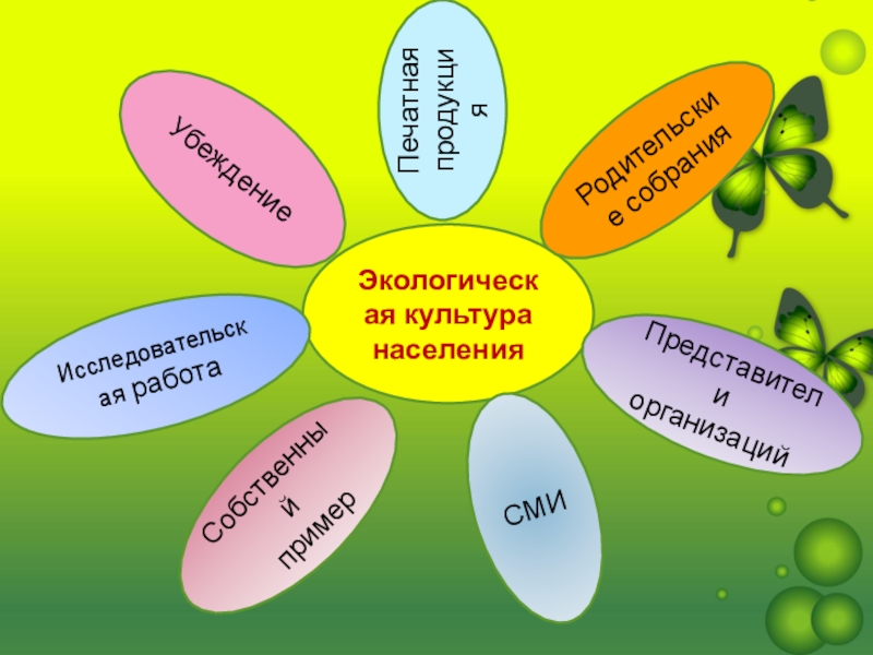 Экологическая культура населенияСМИРодительские собранияПечатная продукцияИсследовательская работаСобственный примерУбеждениеПредставителиорганизаций