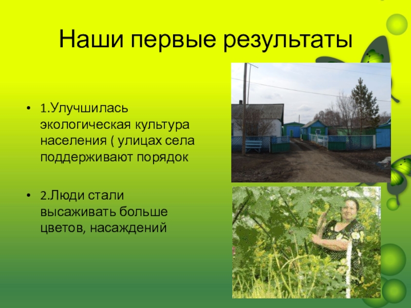 Наши первые результаты1.Улучшилась экологическая культура населения ( улицах села поддерживают порядок2.Люди стали высаживать больше цветов, насаждений