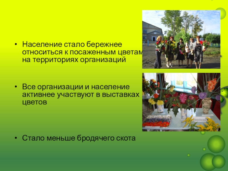 Слайд 25Население стало бережнее относиться к посаженным цветам на территориях организаций