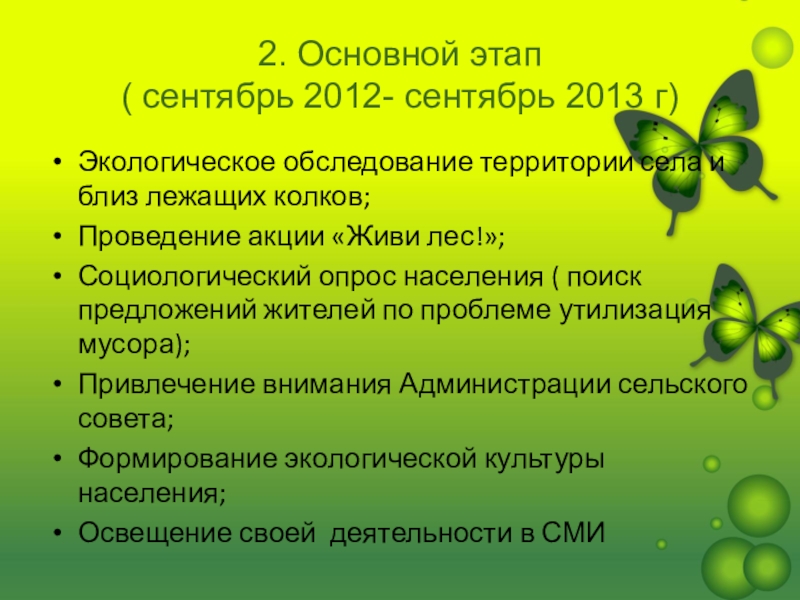 2. Основной этап ( сентябрь 2012- сентябрь 2013 г)Экологическое обследование территории села и близ лежащих колков;Проведение акции