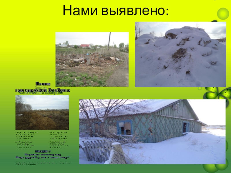 Актуальность:Обусловлена тем, что на территории нашего поселения в последние годы экологическая обстановка значительно ухудшилась:увеличилось количество бытовых отходов; несанкционированных свалок;увеличилось количество отходов от содержания сельскохозяйственных животных (навозные кучи);захламление близлежащих колков и полян. 2.Небрежное отношение населения ко всему
