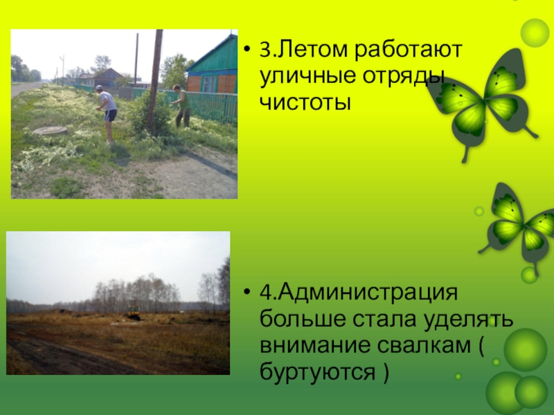 3.Летом работают уличные отряды чистоты4.Администрация больше стала уделять внимание свалкам ( буртуются )