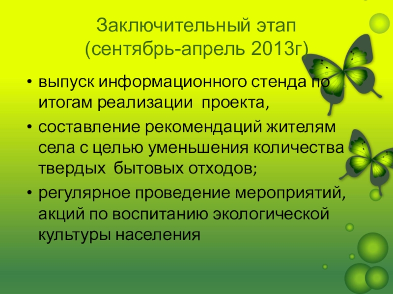 Заключительный этап  (сентябрь-апрель 2013г)выпуск информационного стенда по итогам реализации проекта,составление рекомендаций жителям села с целью уменьшения
