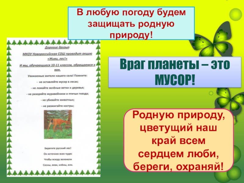 Враг планеты – это МУСОР!В любую погоду будем защищать родную природу!Родную природу, цветущий наш край всем сердцем