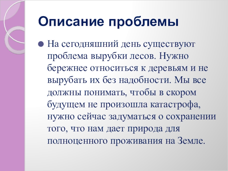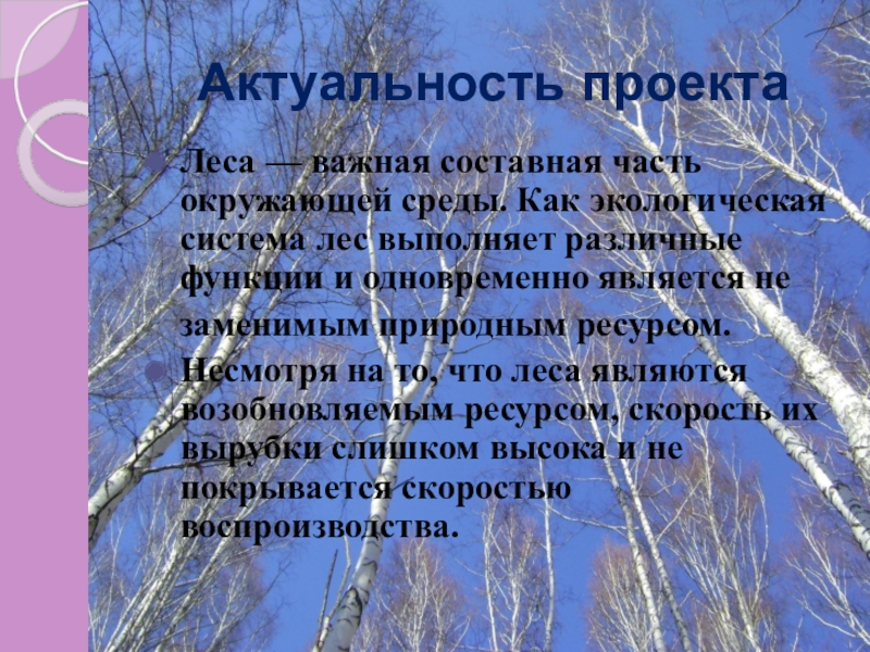 На сегодняшний день существуют проблема вырубки лесов. Нужно бережнее относиться