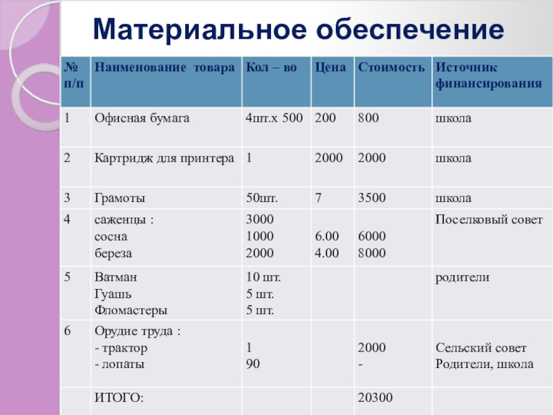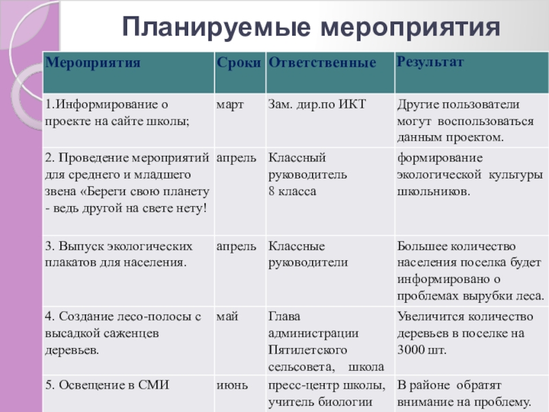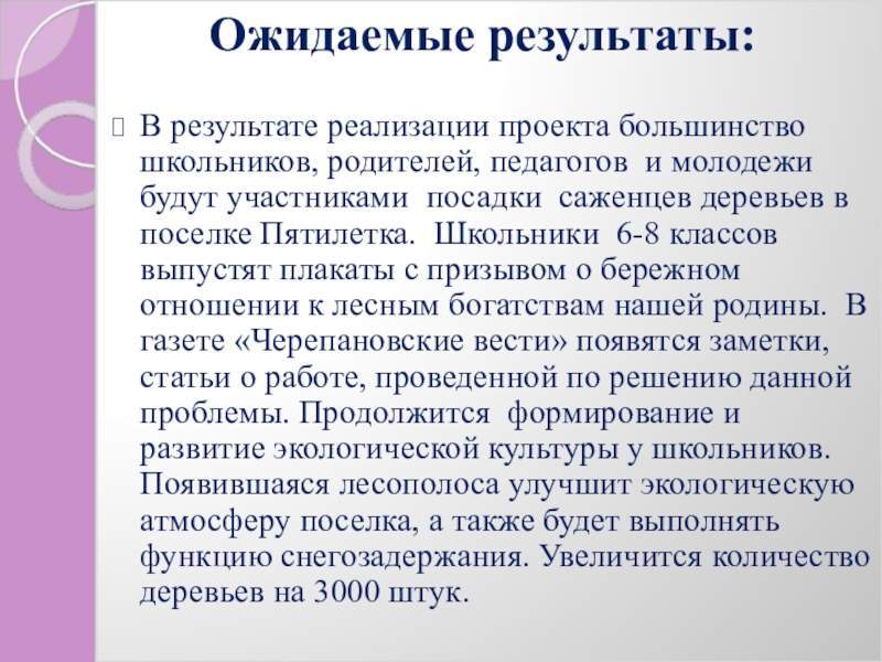 участниками посадки саженцев деревьев в поселке Пятилетка. Школьники 6-8 классов выпустят плакаты с призывом о бережном отношении к лесным богатствам нашей родины. В газете «Черепановские вести» появятся заметки, статьи о работе, проведенной по решению данной проблемы. Продолжится формирование и развитие экологической культуры у школьников. Появившаяся лесополоса улучшит экологическую атмосферу поселка, а также будет выполнять функцию снегозадержания. Увеличится количество деревьев на 3000 штук.
