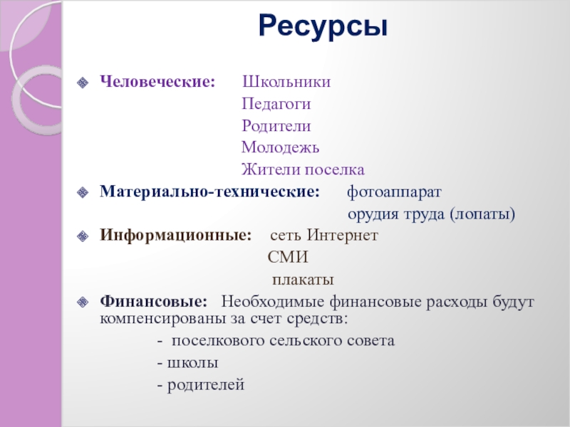 Финансовые: Необходимые финансовые расходы будут компенсированы за счет средств: