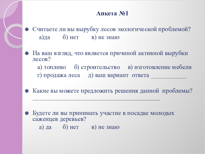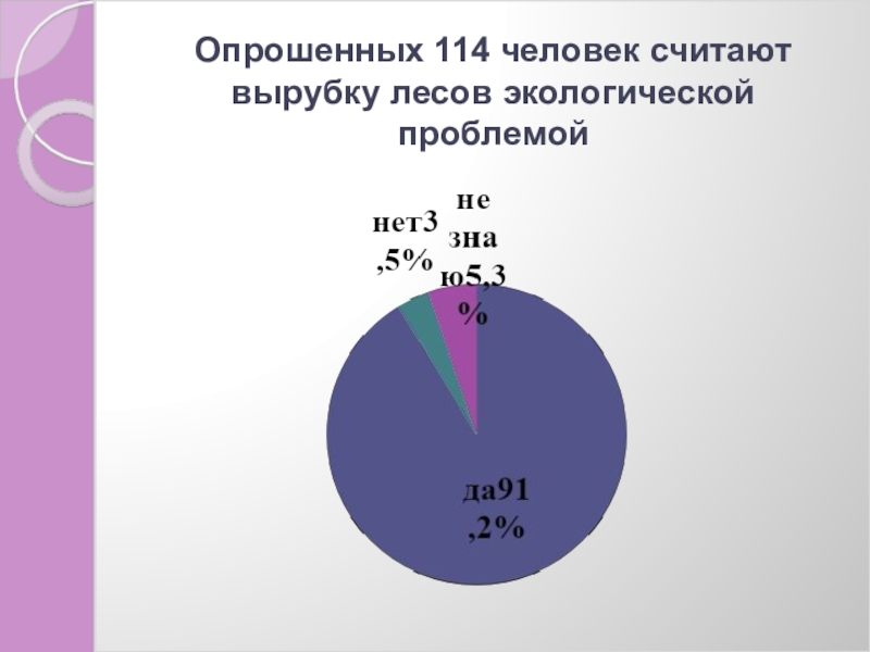 Слайд 10Опрошенных 114 человек считают вырубку лесов экологической проблемой